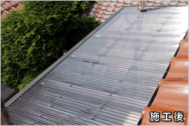 ベランダ屋根のビニル波板が劣化し破れてしまっていますので、ポリカーボネート製の波板に張り替えました。 ポリカーボネート製の波板は、従来のビニル波板に比べ耐久性や採光性に優れた素材です。